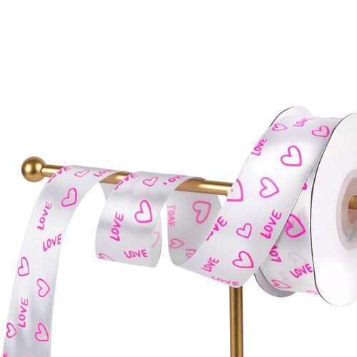 Лента атласная с принтом "LOVE" 2,5см*25 ярдов Белый с розовым ЛД24/2